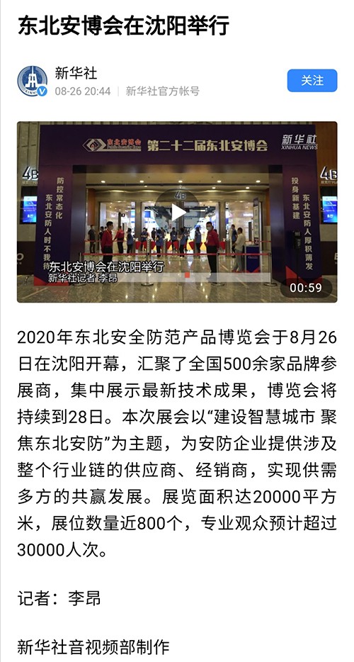 2020年8月26日-28日,由辽宁省社会公共安全产品行业协会、辽宁长城会展广告有限公司主办,辽宁省公安厅科技信息化总队、吉林省社会公共安全产品行业协会、黑龙江省社会公共安全产品行业协会、辽宁省消防协会、辽宁省社会公共安全产品行业协会应急专业委员会协办的“2020第二十二届东北国际公共安全防范产品博览会暨辽宁消防产品与应急救援展览会在沈阳新世界博览馆顺利举办。