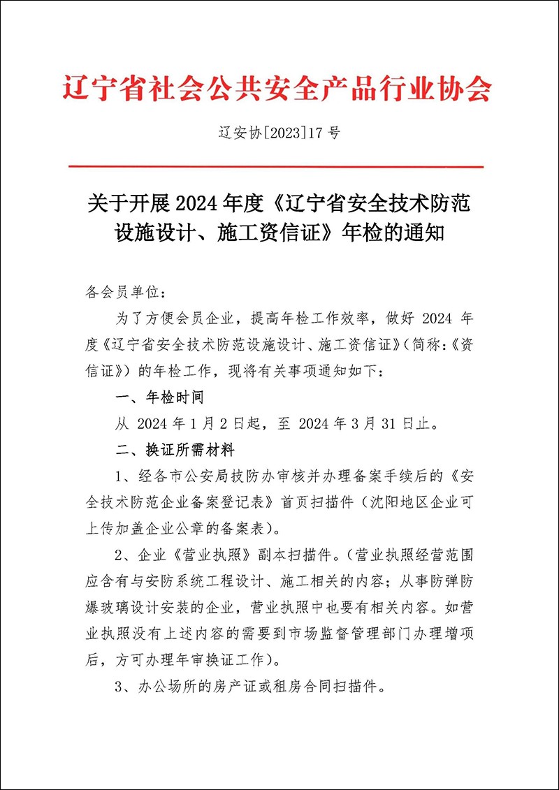 关于开展2024年度《辽宁省安全技术防范设施设计、施工资信证》年检的通知