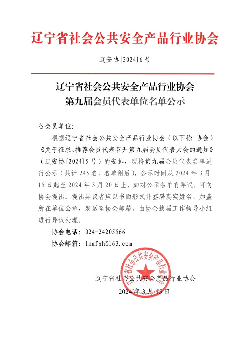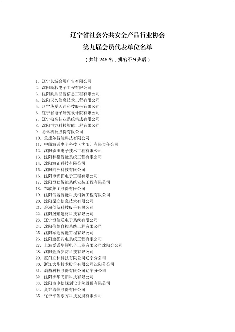 辽宁省社会公共安全产品行业协会第九届会员代表单位名单公示