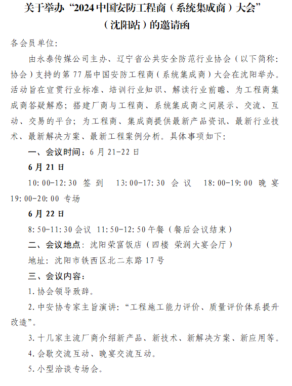 关于举办“2024中国安防工程商(系统集成商)大会” (沈阳站)的邀请函