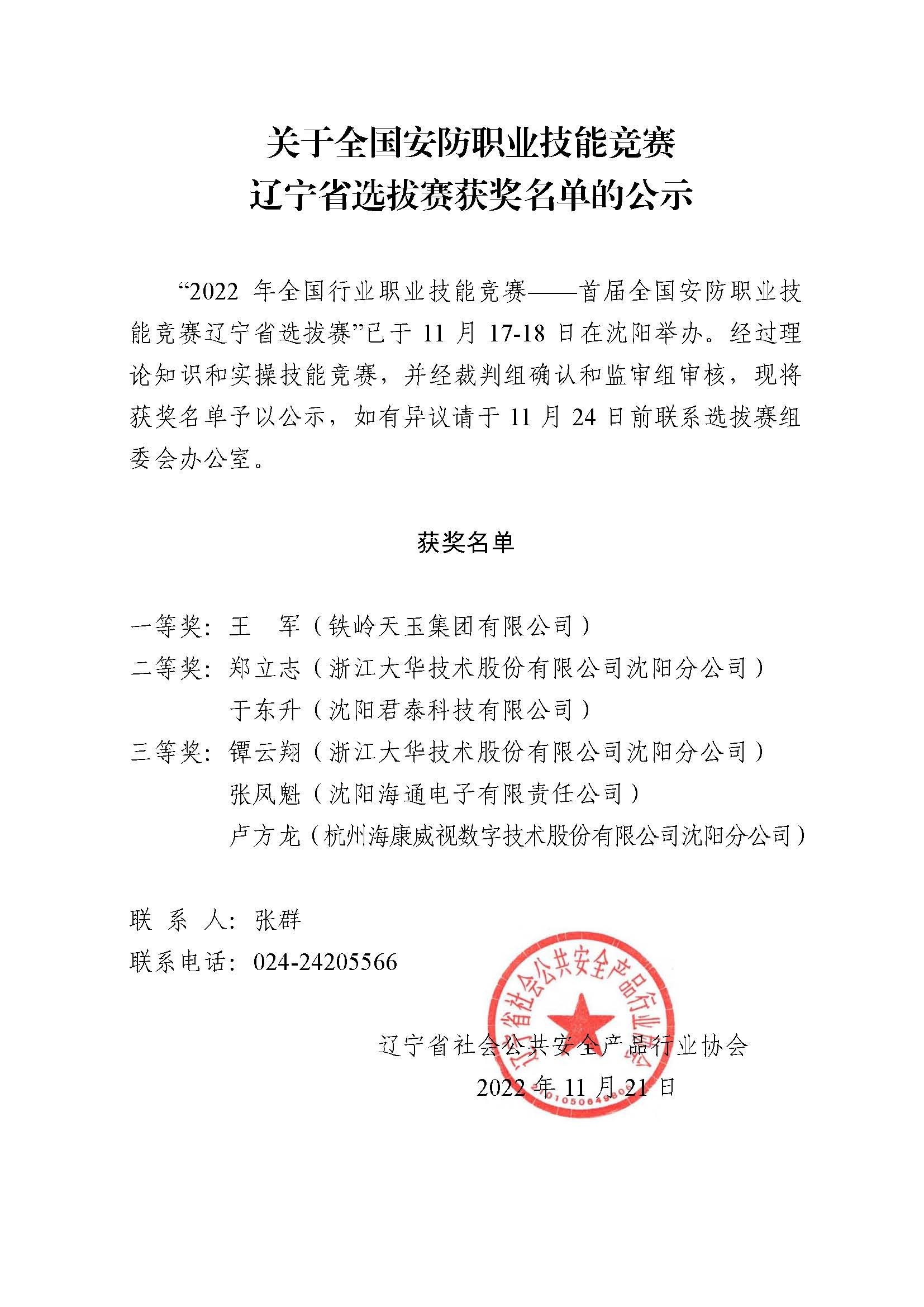关于全国安防职业技能竞赛辽宁省选拔赛获奖名单的公示